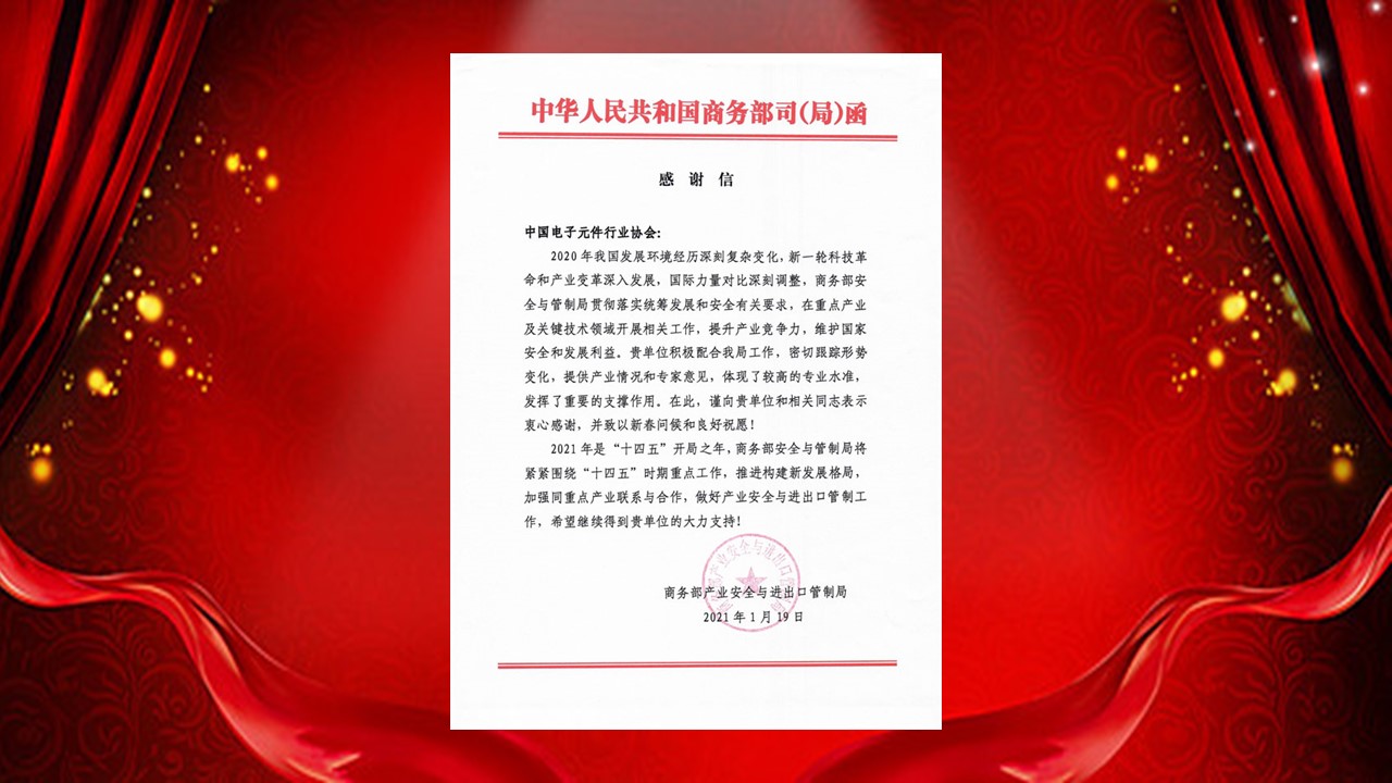 中国电子元件行业协会收到商务部产业安全与进出口管理局感谢信