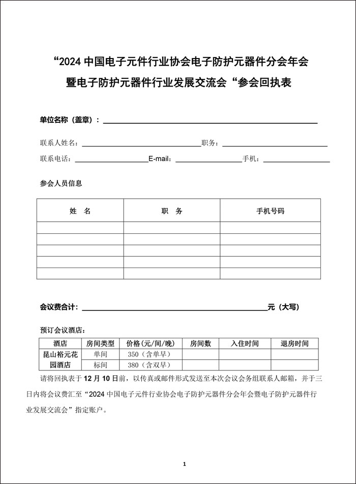 附件:“2024中国电子元件行业协会电子防护元器件分会年会“参会回执表