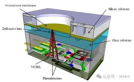 sensiBel的光学MEMS麦克风技术起源于挪威科技工业研究所(SINTEF)的多年研究。上图为sensiBel光学MEMS麦克风原型的剖面图,展示了其工作原理:利用一颗垂直腔面发射激光器(VCSEL)照射位于麦克风振膜正下方的衍射透镜,然后利用一颗或多颗光电探测器测量其一个或多个衍射级的光强度信号。