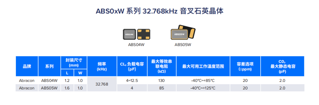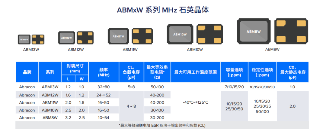 ABMxW 和 ABSxW 系列提供多种封装、稳定性和初始误差等选项,其中频率初始误差可低至±10ppm。另外,ABMxW 和 ABSxW 系列晶体工作温度范围可宽至-40°C 至 125°C,适用于消费领域和工业电子设计等应用。