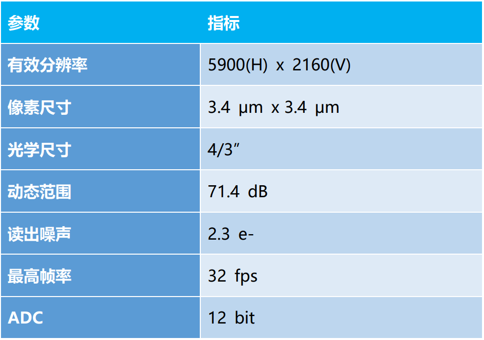 GMAX3413有效分辨率为 5900(H) x 2160(V)(1270万像素),像素尺寸3.4 μm、光学尺寸为4/3'',得益于先进的像素设计,可实现 2.3 e- 的读出噪声和71.4 dB的线性动态范围。GMAX3413最高帧率为32 fps @12 bit,采用8对LVDS通道进行数据传输。