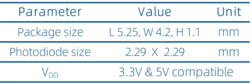 关键特性• 光电二极管尺寸:90MIL• 工作电压:3.3V,5.0V兼容• 电流放大器:20倍产品优势• 响应速度快• 前端 PD 尺寸大• 闻值电压可调 (外部电阻) • 小尺寸贴片封装主要特点