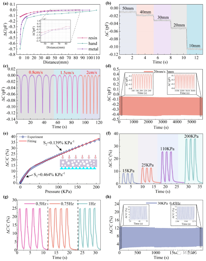 所提出的双模传感器具有很高的传感性能,对人手的非接触距离检测范围可达110mm,对不同接近速度的物体也能很好的区别检测,且具备良好的信号稳定性。压力检测范围为0至200kPa,具有两段线性灵敏度,最大灵敏度为0.464% kPa⁻¹。此外,该传感器还能有效区分近距离信号和触觉信号,并具有出色的信号稳定性、可重复性和准确识别手势动作的能力。