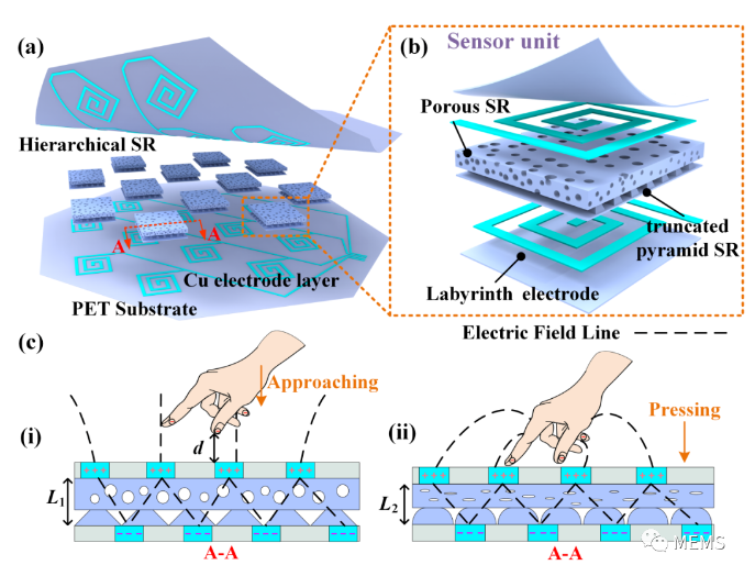 该传感器的结构如图1所示,它由三层组成:顶层和底层是带有迷宫式铜电极的PET,顶层和底层电极之间夹着一层硅橡胶电介质层,具有多孔-截断金字塔双层微结构。传感器分为12个传感单元,每个传感器单元由一对互补的迷宫电极和一个多孔-截顶金字塔分层电介质组成。通过将电极设计成方形迷宫结构加强边缘电场,从而提高近距离感知性能。多孔-截断金字塔分层电介质层的设计旨在通过分层变形来改善硅橡胶的变形能力,从而提高压力传感性能。