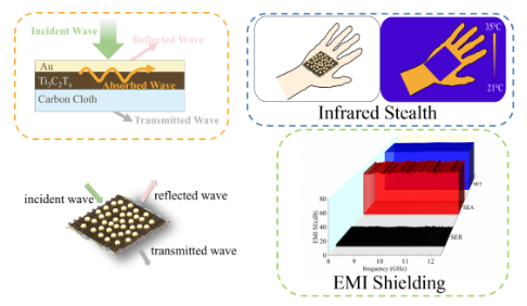 Ti3C2Tx是一种二维碳氮化物过渡金属材料,因其高导电性和多活性基团而备受关注。当前,这种材料已被应用于电磁屏蔽、热管理等多个领域。然而,随着柔性智能设备的发展,Ti3C2Tx在柔性智能领域上受到了限制。此外,由于雷达探测和红外探测方法的不同,目前能够兼容红外隐身和电磁屏蔽多波段应用的材料非常少。