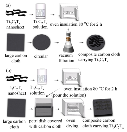 该团队将Ti3C2Tx二维过渡金属材料与碳布结合,通过真空过滤法或浸泡法进行制备,如图2所示。Ti3C2Tx材料是MXene材料的一种,其二维形貌、表面等具有足够的官能团,且导电性强,导电面积大,在研究中通过一些方式如真空过滤法、浸泡法等易于与其他材料形成复合材料,以提高目标材料的物理和化学性能。