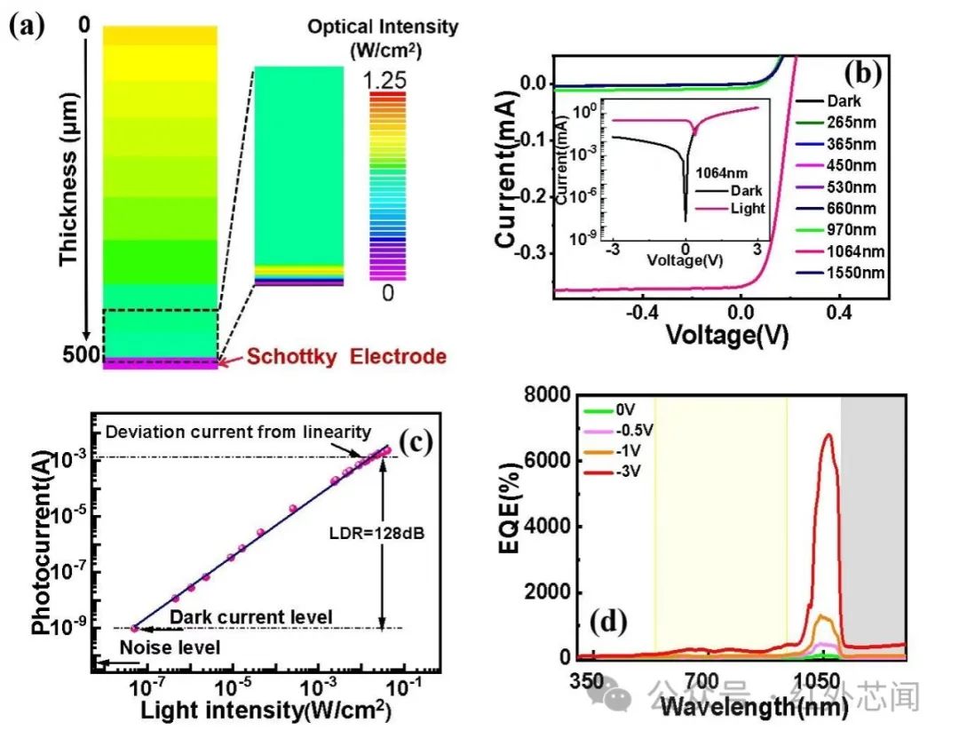 图3 (a)器件内光强分布模拟结果,零偏压下;(b)器件在不同波长光照下的电流-电压曲线;(c)线性动态范围;(d)不同偏压下器件的外部量子效率随波长变化曲线。