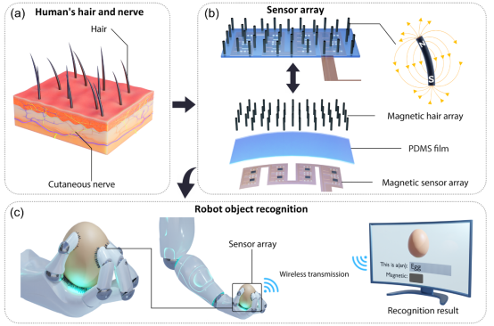 近日,中国科学院空天信息创新研究院陈嘉民研究团队开发了一种柔性磁敏触觉传感器,这种传感器模仿了人类皮肤毛发的结构,能够精确地感知接触力,在机器人物体识别和滑动检测方面表现出色,开启了智能机器人感知世界的新篇章。