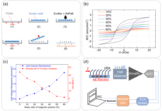 图2 传感器的制作工艺、不同磁粉含量的纤毛性能表征和传感器电路设计