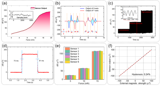 这款传感器的设计独特,由上至下分别是仿生磁性纤毛阵列、柔性聚二甲基硅氧烷(PDMS)薄膜,以及底层集成磁传感器阵列的柔性电路板(FPC)。当有外力触碰磁性纤毛,纤毛周围的磁场会发生变化,通过高灵敏的磁传感器,就能计算出力的大小和方向。其超高的0.2 mN分辨率,稳定的0至19.5 mN工作范围以及毫秒级的响应时间,让这款传感器不仅能测量静态力,还能精准捕捉动态变化。