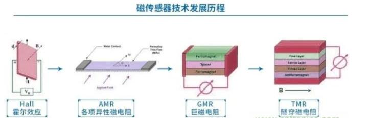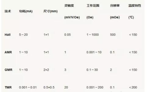 TMR磁传感器相比较霍尔传感器、AMR(各向异性磁阻传感器)磁传感器和GMR(巨磁阻)磁传感器具有更大的电阻变化率。