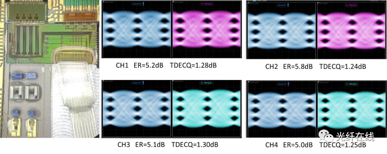 SiFotonics的400G硅光引擎方案包括SiFotonics自研400G DR4 硅光集成芯片(PIC)以及特别匹配优化设计的自有硅光调制器驱动芯片(Driver),使用源杰半导体的大功率连续波激光器(CW Laser)作为光源。测试结果显示出优异的发射器性能:3dB电光带宽超过45GHz, 每个通道在消光比超过5dB的情况下实现了TECQ均小于1.3dB。测试所用硅光引擎照片以及输出光眼图结果见下,该光引擎方案中使用透镜将源杰CW Laser的出光直接耦合进硅光芯片,耦合效率可达70%,光输出端口使用光纤阵列与硅光芯片耦合,driver和硅光芯片通过打线的方式进行电的连接。